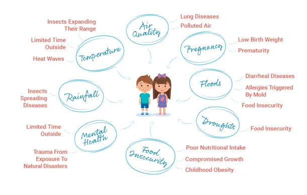 Air pollution can disrupt development in the womb and lead to chronic lung conditions such as asthma. Heat waves prevent children from playing and exercising outside, which may increase child obesity. The kiddos who play outside regardless of the weather are more at risk of experiencing heat strokes and exposure to disease-carrying insects.